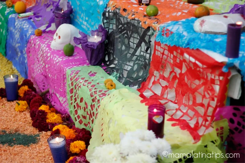 Estas ofrendas incluyen fotos de nuestros seres queridos y algunas de sus cosas favoritas. Velas, flores de cempazúchitl, papel picado y por supuesto calaveritas de azúcar.