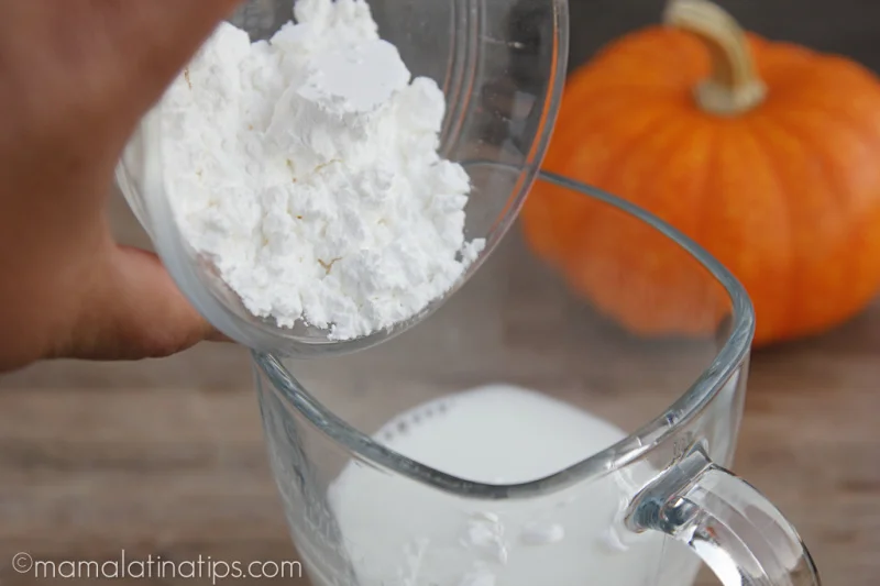 Cuando la leche con la calabaza comience a elevarse, vacía la fécula de maíz con la leche, asegúrate de revolvelo bien antes de vaciar.