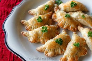 Toma el exceso de masa de las dos láminas de hojaldre, amasa por unos segundos y extiende con el rodillo hasta lograr una lámina delgada. Forma más empanadas, te saldrán entre 4-6 más.