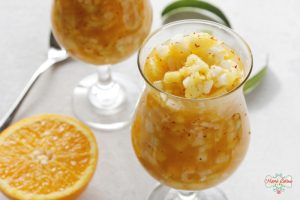 Si quieres que la fruta esté bien crujiente te recomiendo omitir el jugo de naranja antes de ponerlo en el refrigerador. Al momento de servir divide la fruta en las porciones deseadas (varían dependiendo del tamaño del vaso o copa) y llénalas entonces con el jugo de naranja.