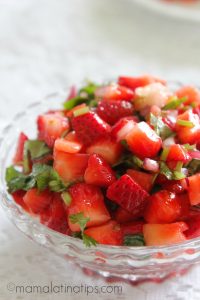Combina fresas, cebolla, chile serrano, cilantro y jugo de limón. Deja aparte.