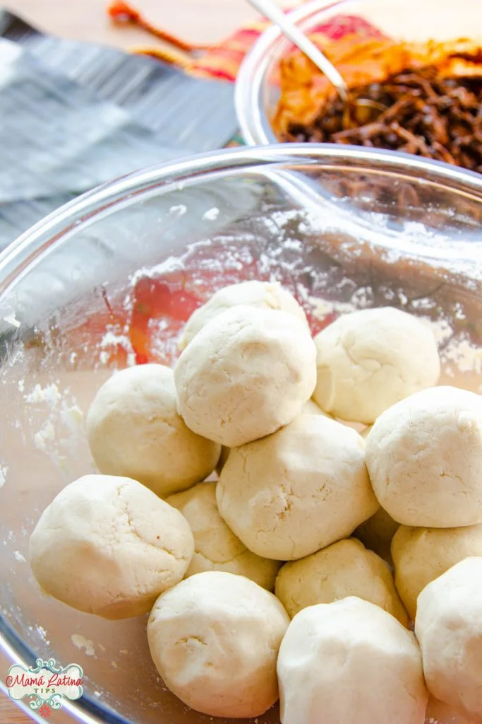 - I recommend dividing the dough into 15-16 equal balls so that all the tamales are more or less the same size. Take a 1/3 measuring cup, fill it with the dough, take it out and form a ball of approx 2 inches (5 cm) in diameter. Repeat.