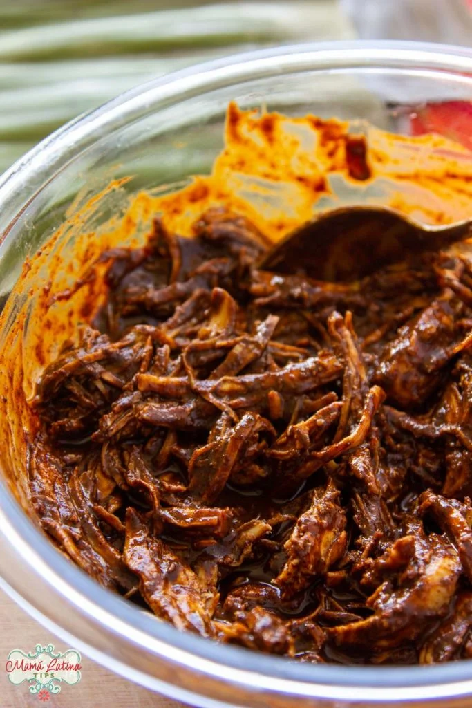 - Mix the cooked and shredded chicken with the mole until well integrated. Cover and set aside until ready to use.