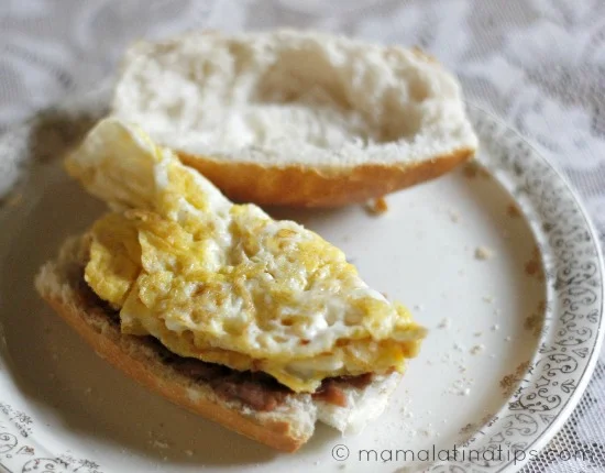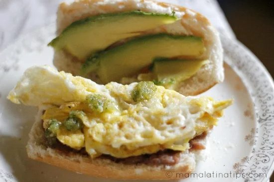 Warm the beans and start frying one egg at a time. Spread beans on the bottom half of the bolillo and add the egg on top of the beans. Cut a few slices of avocado and spread them on the top half of the bolillo.