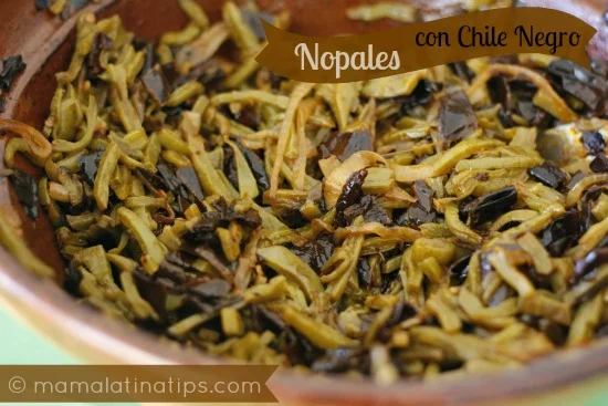 Nopales, or cactus leaves, are one of the most popular dishes in Mexico, not only because there are tons of cactus in the country, but because nopales are very easy to cook. This makes them a great meatless dish. One of my aunts makes them in a way I had never seen before. Usually they are cooked with tomatoes, onions, cilantro and chile, but she cooks them with chile negro. Here's the recipe:
