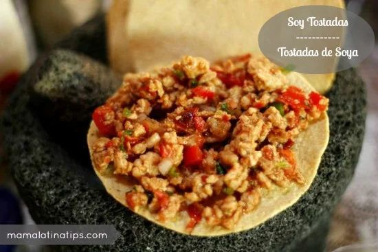 Soy is a great meat substitute, it has a similar consistency and it will take the flavor of anything you pour over it. A few months back I tried these tostadas at my aunt's house and I couldn't stop eating them! They are easy to make and very refreshing. Last time we made them, I had them for three days in a row and the flavor just kept getting better.