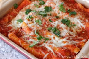 Warm your tortillas in batches, 5-6 at a time. You can do it on a comal or in the microwave. Take one tortilla, dip it into the warm tomato sauce, then fill it up with cotija cheese, roll and place filled tortillas with opening down into the oven proof dish, repeat until all the tortillas are filled.