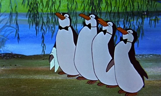 ….descansamos para ir a comer lunch y estaba platicando con Bruce Hoy sobre lo buena que era la comida, y enfrente de mi había un micrófono, y Bruce se levantó la camisa e se dió unas palmaditas en el estómago.  Y alguien dijo “¿quien hizo ese ruido cerca del micrófono?” Así que cuando veas los pinguinos, piensa en los cinco bailarines con sus camisas levantadas dándose palmaditas en el estómago, así es como el doblaje del baile de los pinguinos se hizo.”