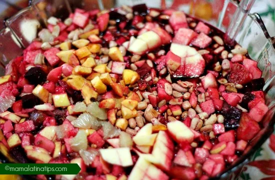 The fruit floats in an exquisite combination of beet and jamaica juice. This recipe makes plenty for all 35 of my family who are regularly together each Christmas and then some. I usually eat two or three cups of it myself.