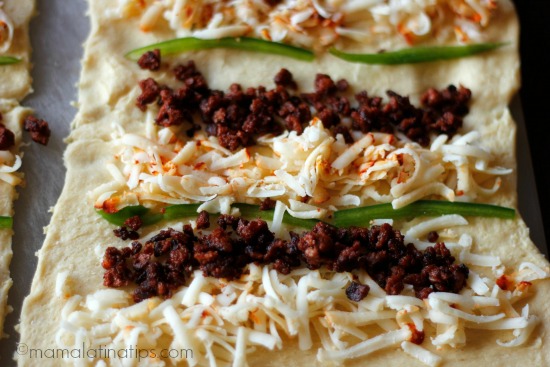 Sobre la masa extiende una línea de rajas de jalapeño (verde), una línea de queso enchilado (blanco) y una línea de chorizo (rojo) y repite hasta que toda la masa esté cubierta, tal como lo muestra la foto.