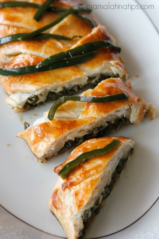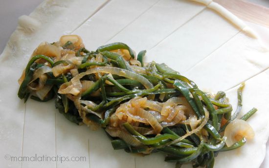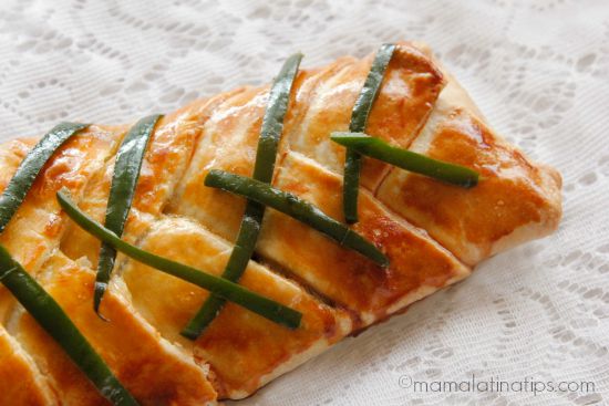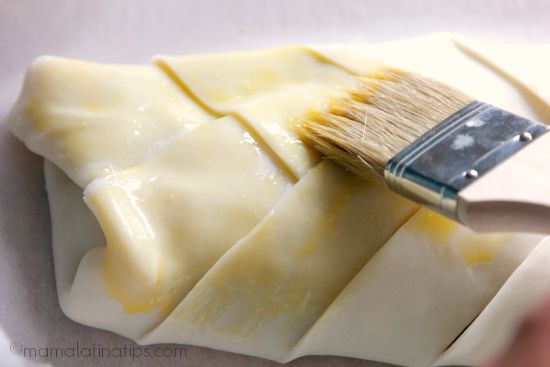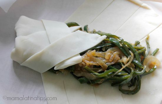 - With a knife, cut diagonal lines from center to edge on both sides of the crust, just make sure the cut starts 1/2 inch from either side of the filling (cheese and rajas-soy sauce mix). Fold the 1/2 inch uncut side over the top of the filling, then braid by taking the first strip from the right side, crossing it over from right to left on top of filling. Then take a strip from the left side, move it from left to right over top of the filling and repeat until finished.