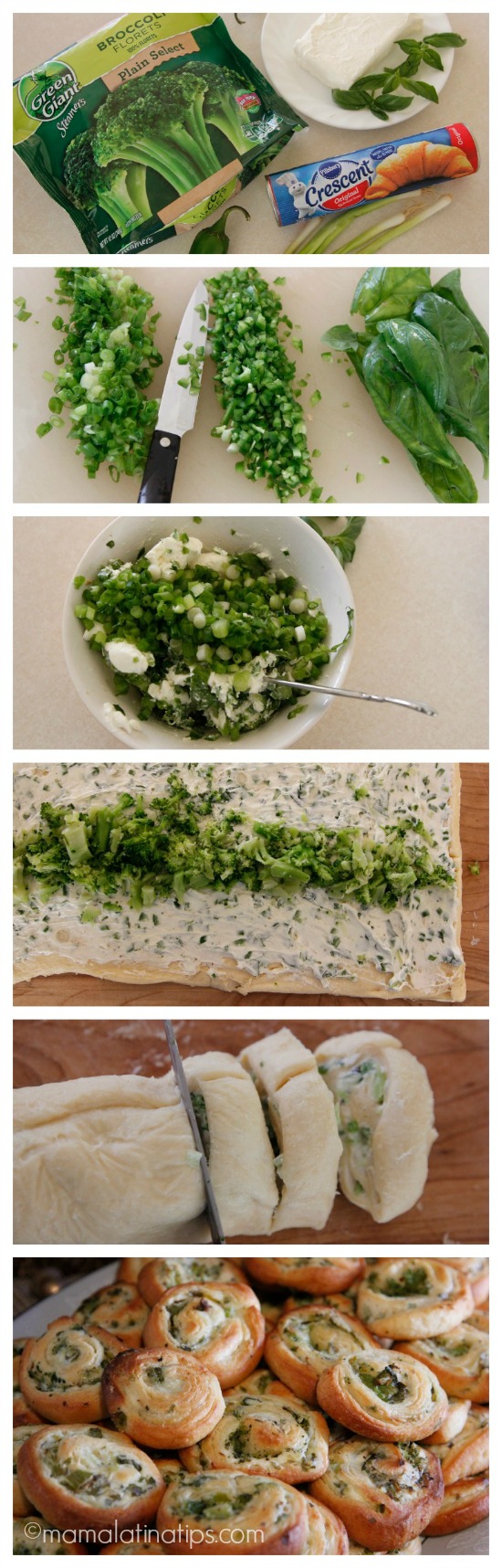 Open one package of Pillsbury™ Crescents and extend it over a clean surface. Spread 1/2 the cream cheese mixture and top with the broccoli. Add salt and pepper. Roll up the dough, repeat.