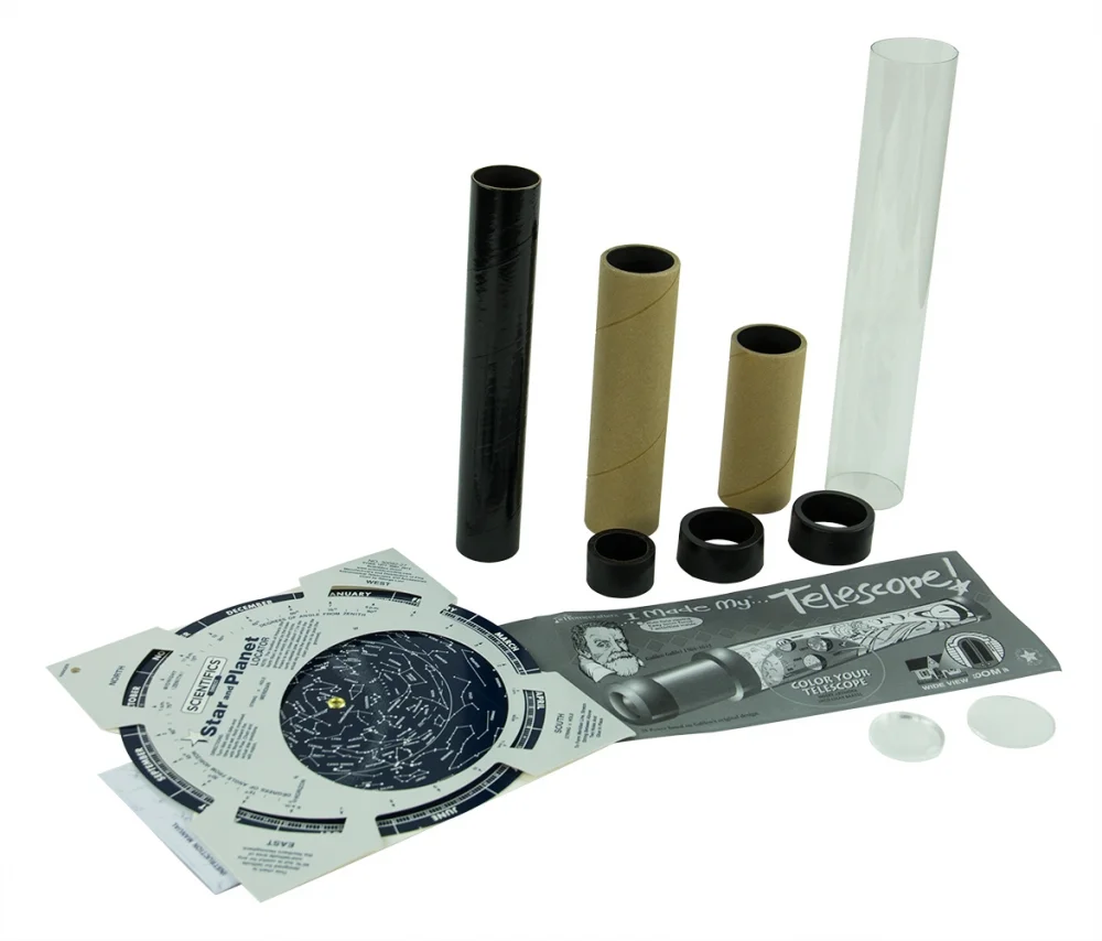 Don't have a telescope? Make your own! This kit includes an objective lens, an eye lens, glare stops, kraftboard tubes, instructions and a Scientific Star and Planet Locator. For ages 8 and up