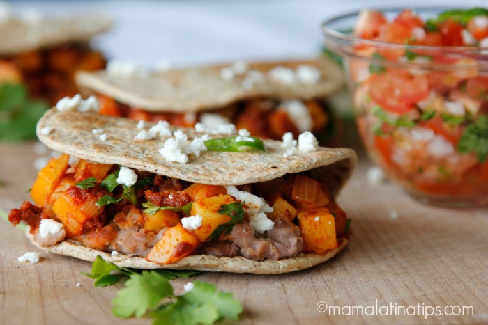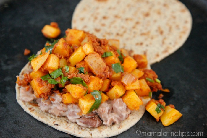 Heat up refried beans and spread a layer on the flatbread, then a spread a layer of chorizo and potatoes, then finish with queso fresco.