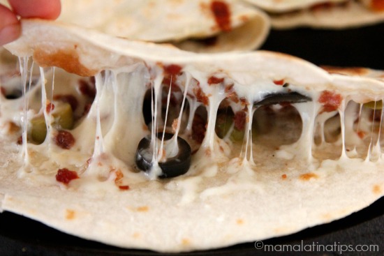 Flour tortilla, low moisture mozzarella cheese and sliced grapes. You'll be surprised how delicious grapes and cheese taste together. You can also use mozzarella fresca cheese, but if you do, don't return to heat. My husband added pico de gallo on top and loved it!