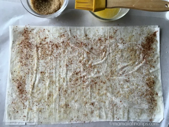 Take the phyllo dough roll and unroll it. Carefully take one of the thin sheets (the roll is made of many sheets, about 18-20) and place it on the parchment or wax paper. Brush the entire surface of the sheet with melted butter, starting from the edges to the center. Add a second sheet on top of the first, brush surface with butter again, then sprinkle two teaspoons of turbinado sugar and cinnamon to taste.
