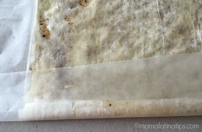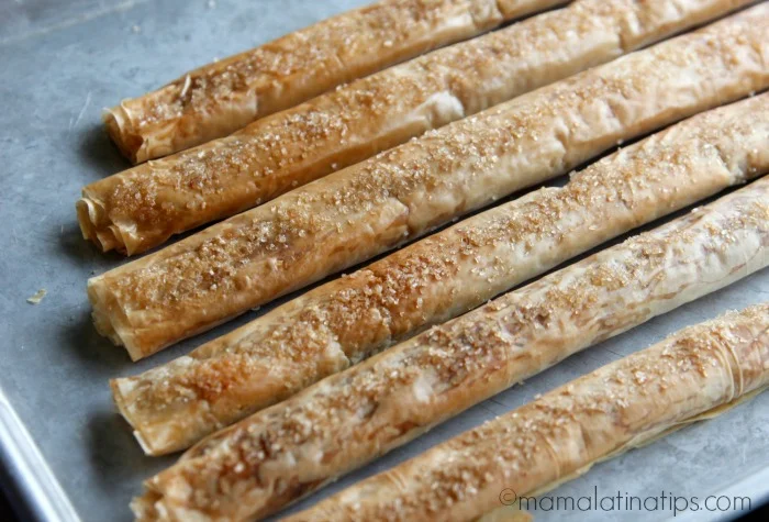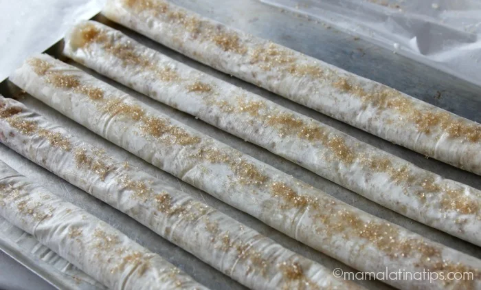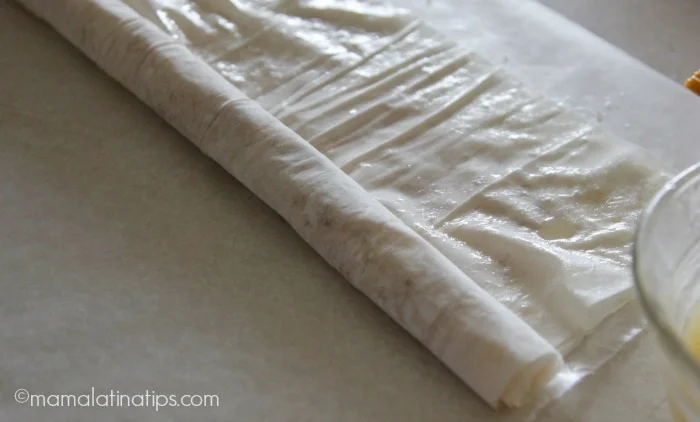 Repeat until you have finished with all phyllo dough sheets. You may end with a couple of extras. In this case, you can make one more roll, just add cinnamon and sugar after the first sheet, or you can save them for later.