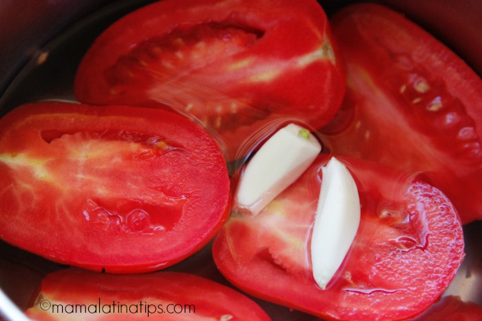 - Place tomatoes (cut in half), garlic cloves and water in a small pot over high heat. When water starts to boil, lower the temperature and let them simmer for 3-4 minutes.