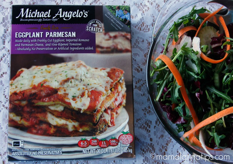 I found one of my favorite Italian dishes in the freezer aisle, Eggplant Parmesan. It was perfect, because I knew if I were to make Eggplant Parmesan on my own from scratch at home, it could take a long time, but I still craved it and it's a dish my kids hadn't tried yet. Michael Angelo's Eggplant Parmesan fit the bill perfectly, it takes little time to prepare (16 minutes in the microwave or 35-45 minutes in a conventional oven) its's made like I would do it at home and it's truly delicious. I can taste every tomato, every eggplant, and they are deliciously covered with imported cheeses. Plus, it has none of those pesky preservatives.