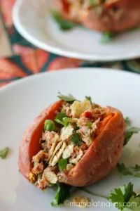 - Fill sweet potatoes with the tuna and top with more green onions and pieces of tortilla chips.
