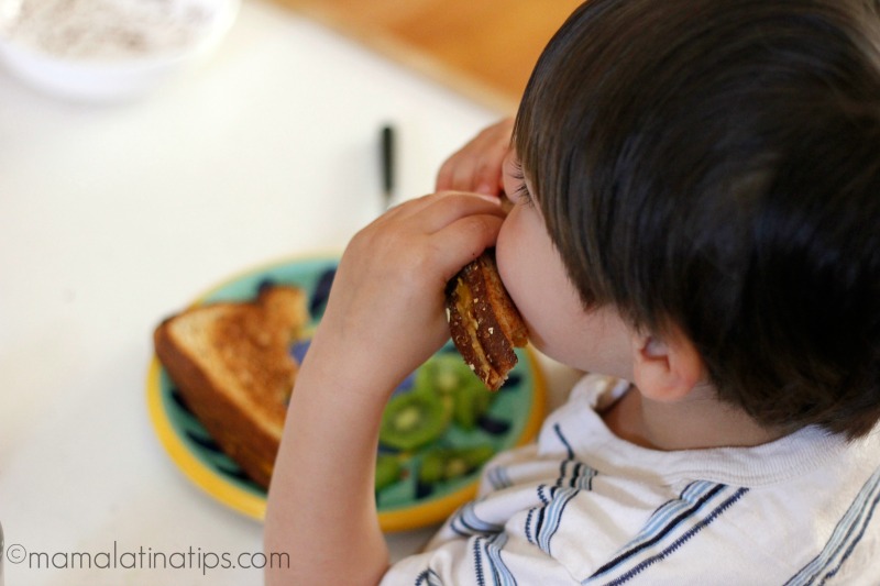 The next technique I've found works well is combining something they really like with a small bit of something I want them to try. Grilled cheese sandwiches with a little kiwi on the side, or pancakes with berries, for instance. The idea is to combine a lot of what they like, with a little bit of what they don't.