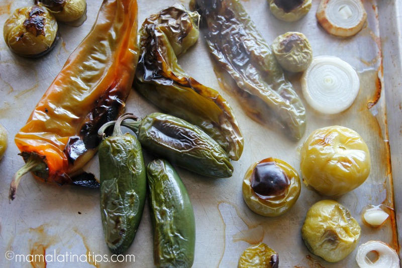 - Place garlic, onions, tomatillos, Anaheim peppers and jalapeño peppers on a baking sheet and place under the broiler. Please be sure to keep an eye on them and turn them at least once as they roast. (Another option, if you don't have a broiler, is to roast them in a pan or on a comal on the stove).