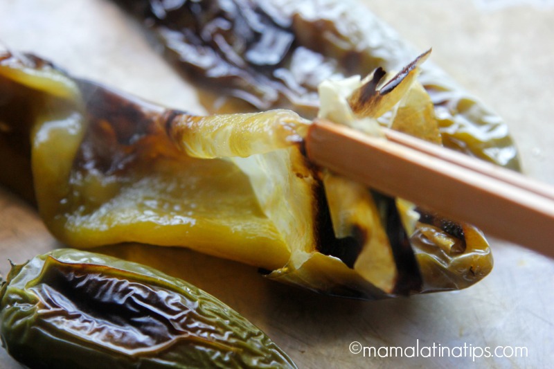 - Take them out of the oven and let it cool down for a few minutes. Peel and seed peppers.