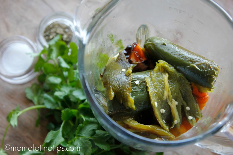 - Place tomatillos, peppers, garlic and onion in blender. Add cilantro, chicken broth, salt and oregano. Mix until well integrated.