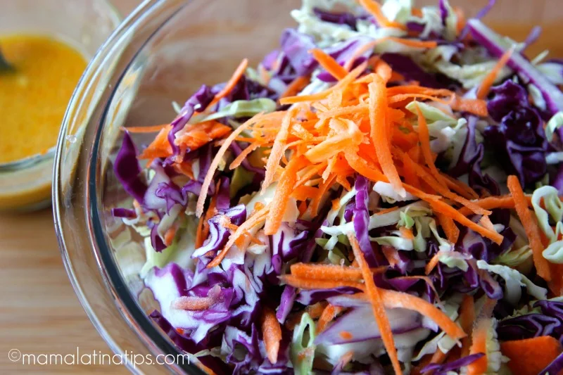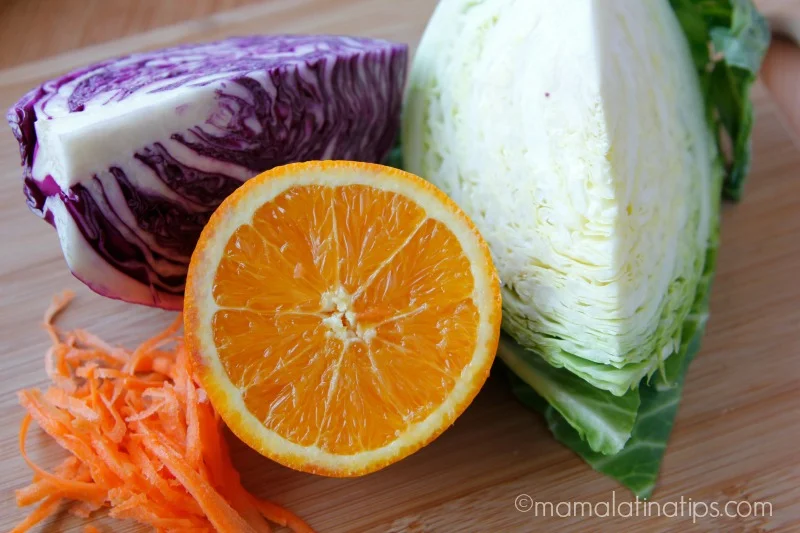 Wash and slice purple and white cabbage, shredded carrot. Set aside