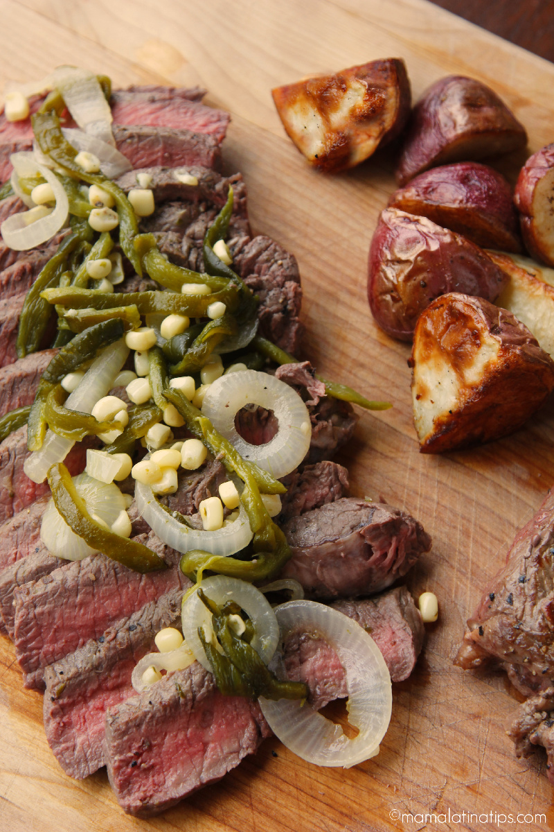 - Slice steaks and serve with the poblano, onion, and corn mixture.