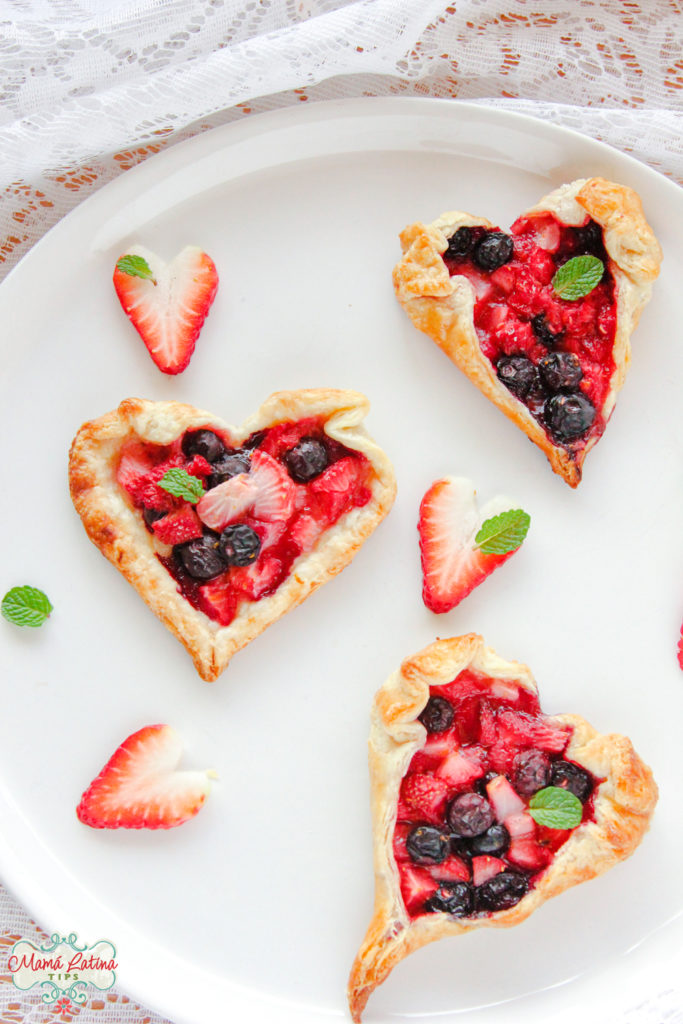 Place 2 tablespoons of the fruit mix in the center of each heart. With your fingers, pinch the dough at the bottom of each heart together. Then, gently fold the dough at the top of the heart to create a heart shape (See photos).
