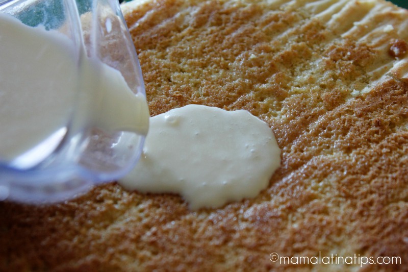 • Blend condensed milk, evaporated milk and half & half. Remove sponges from pan and pierce surface all around with a fork or toothpick. Pour half of the milk mixture over one the warm cake slowly until absorbed, repeat with the second one. Let it rest until cool.