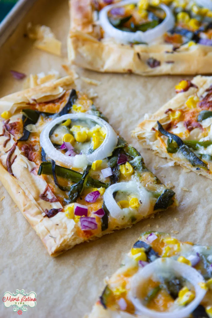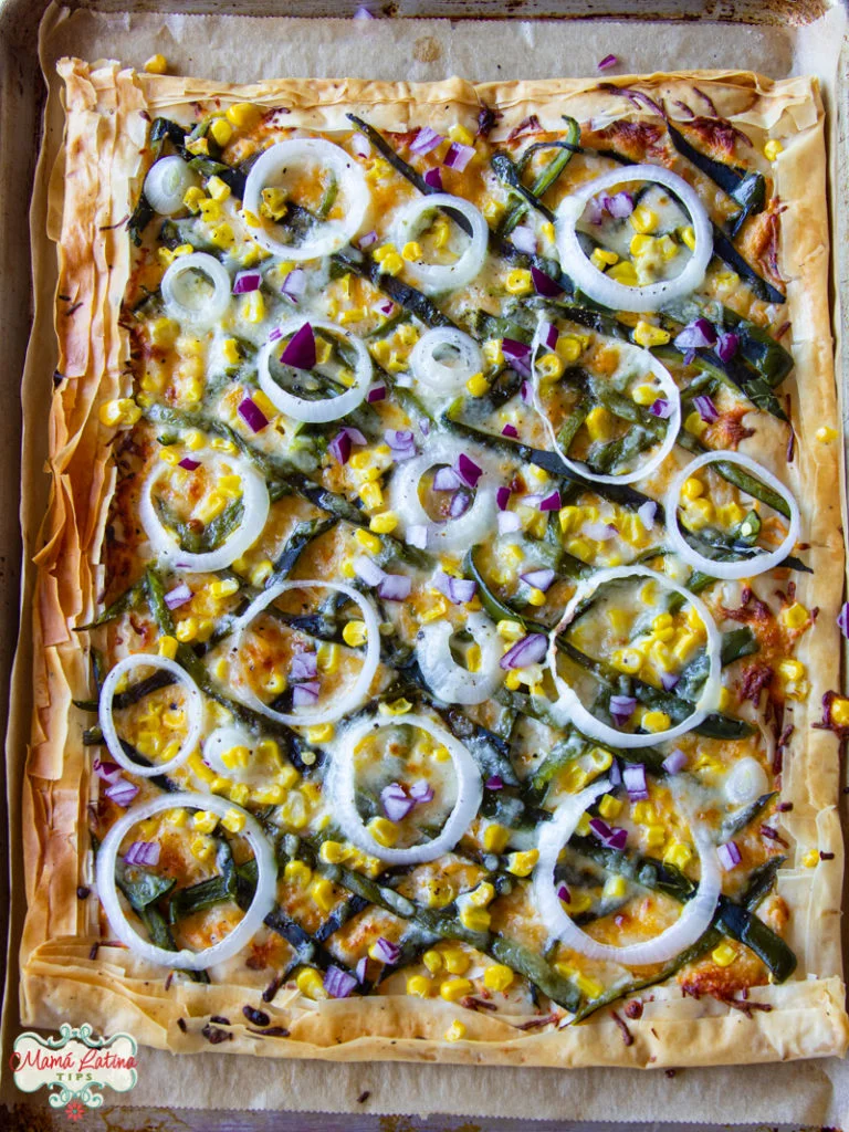 • Carefully take phyllo dough out of oven. Layer with the Taco cheese, then poblano pepper strips, then onion, then the mozzarella & provolone cheese blend and finish with the frozen corn kernels.