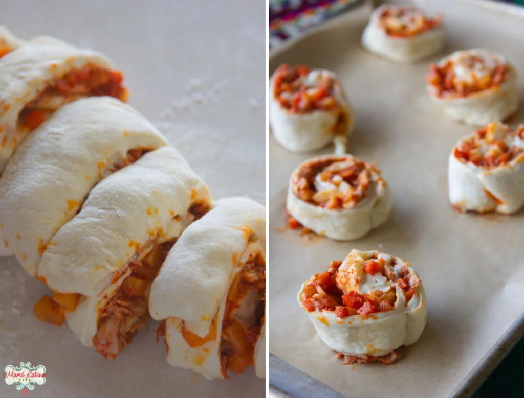 - Spread the chicken enchilada filling on top of the dough. Add a layer of cheese and roll it up.