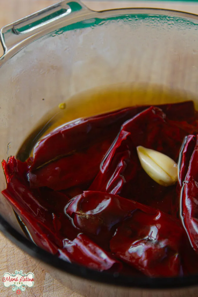 - Seed the guajillo peppers and place them in a bowl, add the garlic clove and cover with boiling water. Place a kitchen towel on top and let them rehydrate for 20 minutes.