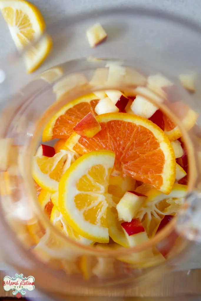 Fruit is an important part of any sangría. Orange and lemon slices give the sangría brightness and balance the sweetness. Crunchy apples give it texture.