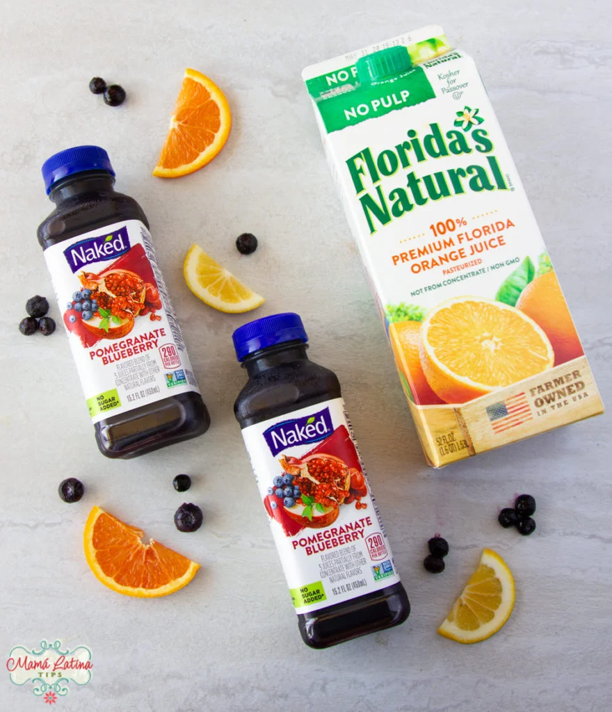 two bottles of Pomegranate Blueberry Naked Juice, one carton of Florida's Natural orange juice and fruit