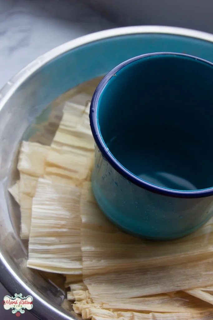 Place the corn husks in a large bowl or pot and cover with very hot water until soft, approximately 30-40 minutes. The husks tend to float in water, so place another pot filled with water on top of them to hold them underwater.