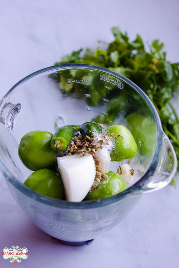 - Next, put tomatillos, 1/2 onion, 2 serrano peppers, 2 teaspoons salt, oregano, cilantro, 2 cooked garlic cloves from the chicken broth and 1/4 cup chicken broth in a blender, and mix until smooth.