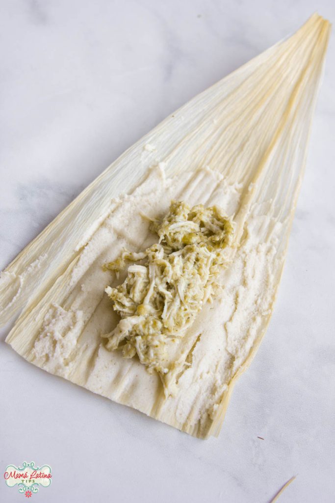 - Add a teaspoon of the chicken filling in the middle of the masa. Fold both sides to cover the filling, the side with no masa will be on top. Then fold the tamal in half and tie. Continue until you’ve used all the masa.