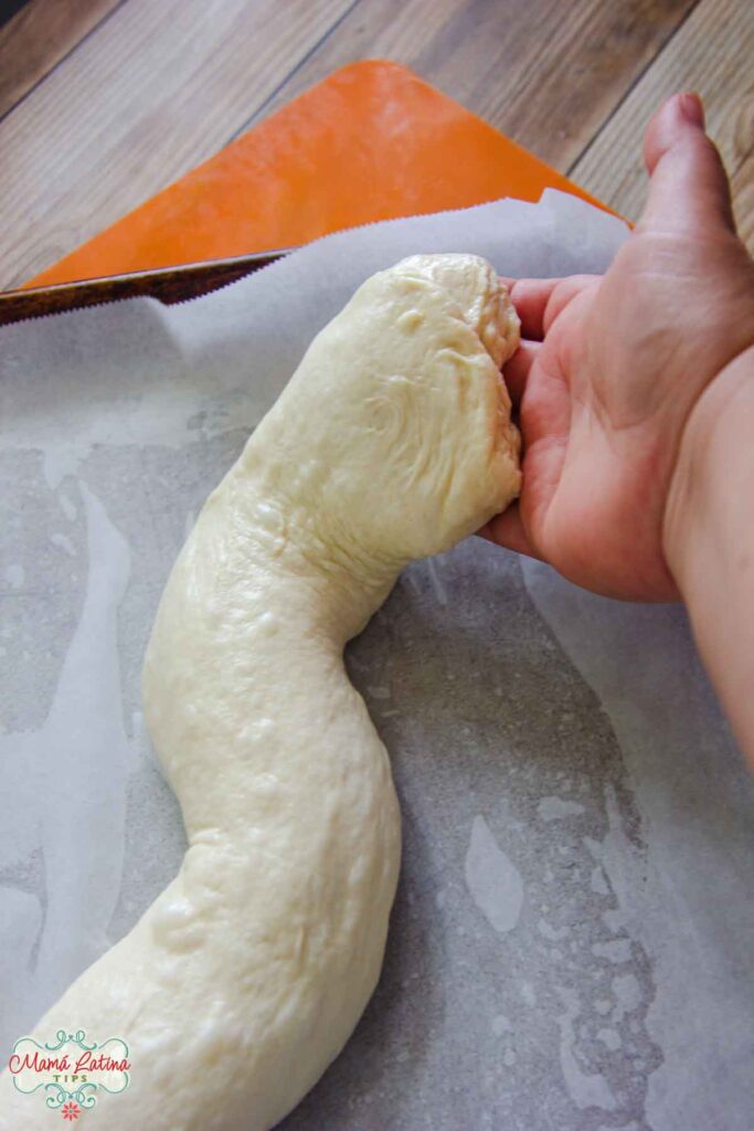- Line the baking sheet with parchment paper or cover with a silicone baking mat. Set aside. Transfer the dough to a clean surface and roll it until you get an 18-inch-long log. Lift it and place it on the baking sheet while creating your favorite slithery shape.