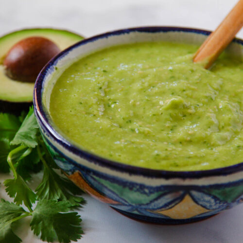 Avocado salsa is creamy and tangy. It's delicious on top of cheese or green tamales, and it's a family favorite.