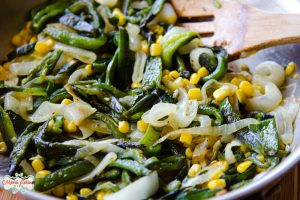- 4 chiles poblanos pelados y cortados en rajas. Como pelar chiles poblanos