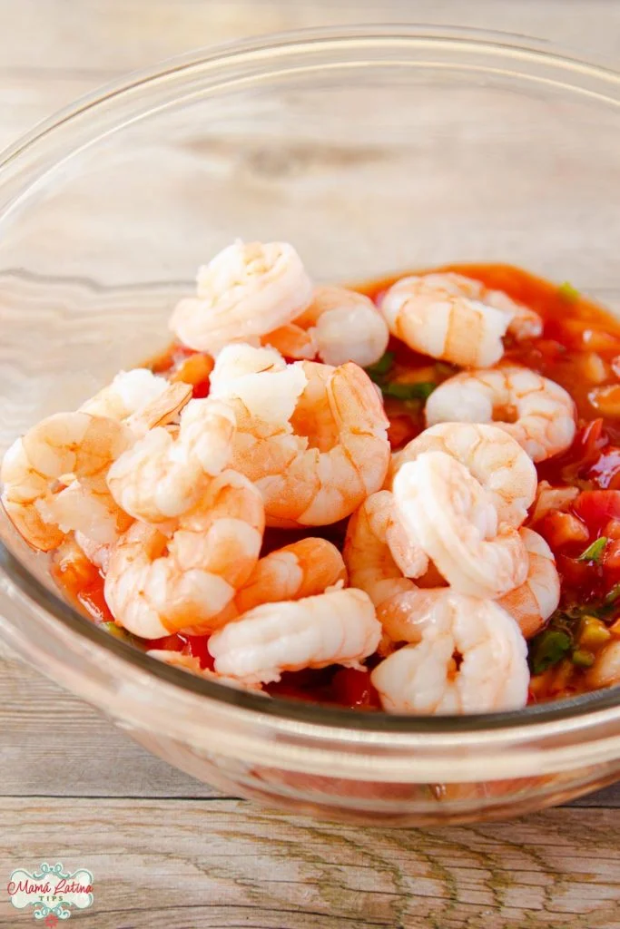 También conocido como cocktail de camarones, es un platillo que se sirve frío y es una combinación de camarones, jugo de limón, verduras y salsa de jitomate.
