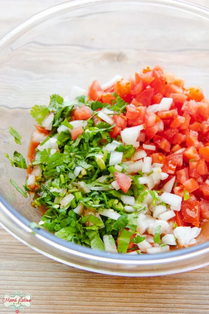 - Pica los tomates, cebolla, chile serrano y cilantro finamente.