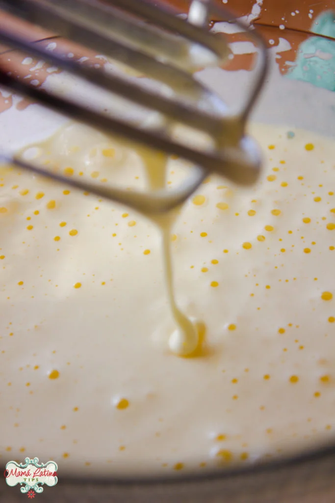 - Mezcla los huevos y el azúcar con la batidora a velocidad alta hasta que esponjen y se vean ligeros. Verás que la mezcla cambiará a un color beige pálido y ls aspas empezarán a dejar marcas. Esto toma aproximadamente 4-5 minutos.