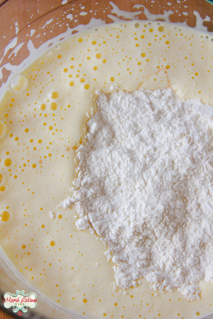 - Cierne harina y polvo para hornear y vacía sobre la mezcla de huevos.