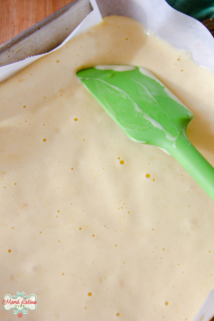 - Vacía la mezcla sobre la charola para hornear y espárcela con la espátula para asegurarte que llega a las cuatro esquinas y se ve nivelada.