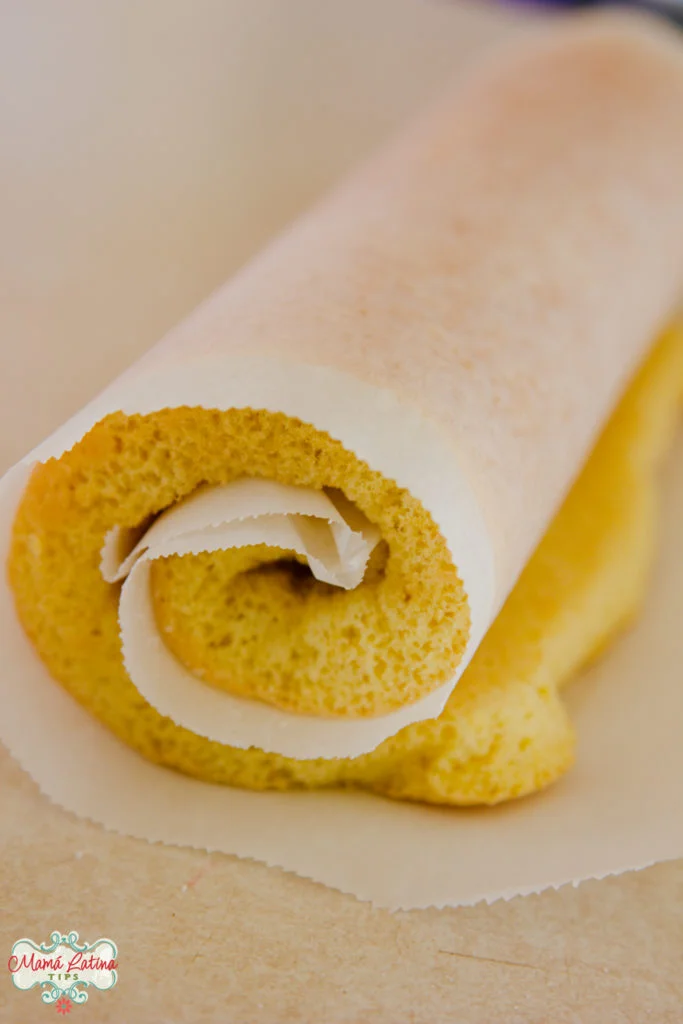 Tip: ¿No tienes papel pergamino para hornear? no te preocupes, engrasa y enharina la charola para hornear y usa una toalla de tela de cocina para enrollar el pastel.