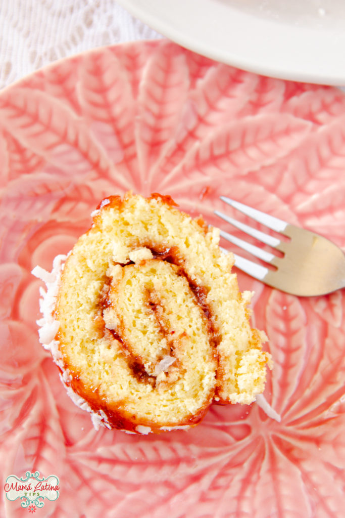 - Enrolla de nuevo, esta vez sin el papel. Asegúrate que la orilla del pastel quede en la parte de abajo. Cubre con el resto de la mermelada y el coco rallado.